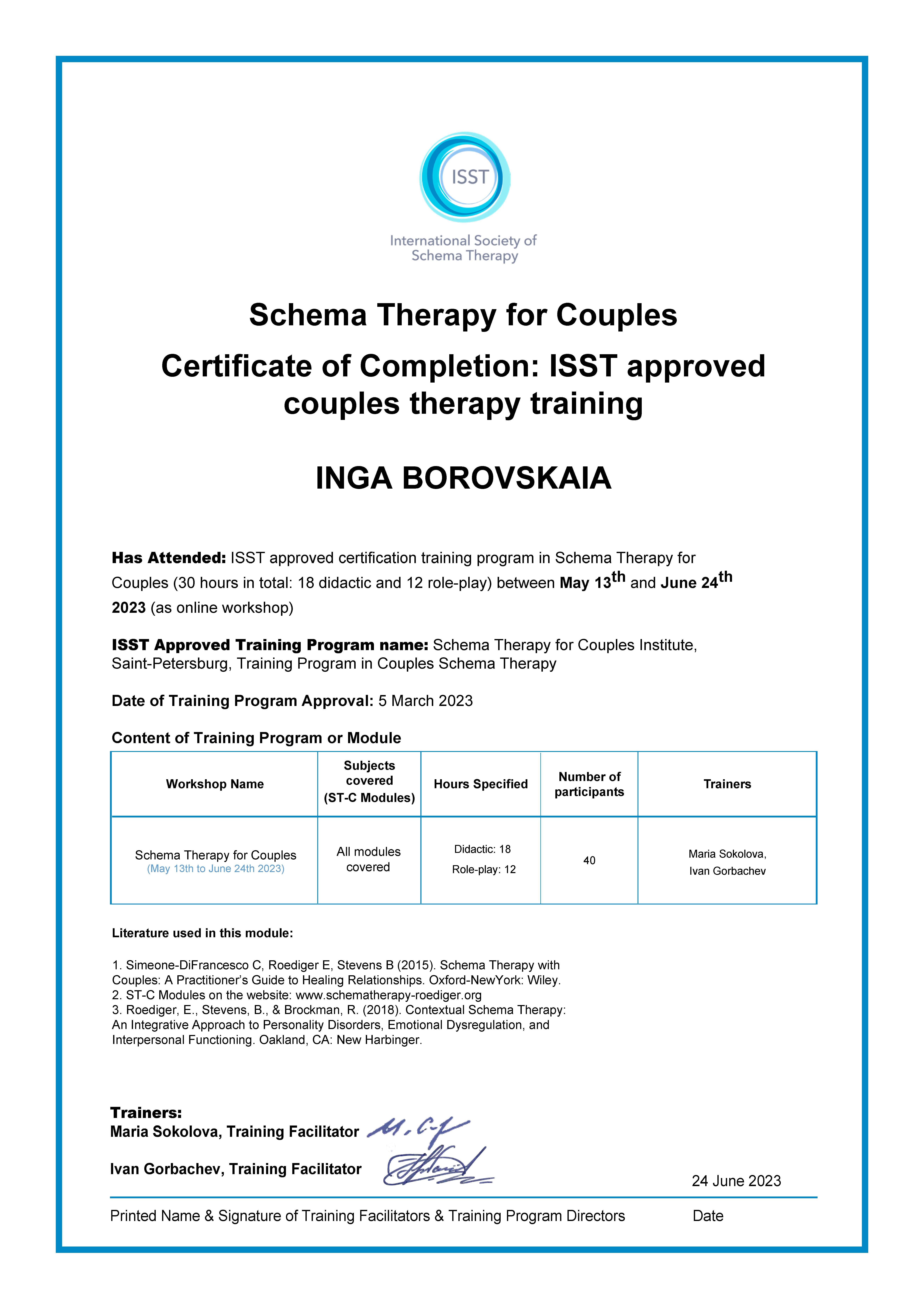 - Psychological Center «Quality of Life» Training and Supervision Program in Individual Schema Therapy, 60 hours, 2022