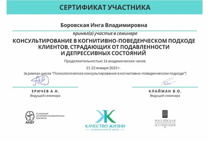- Консультирование в когнитивно-поведенческом подходе клиентов, страдающих от подавленности и депрессивных состояний, 16 часов, 2023