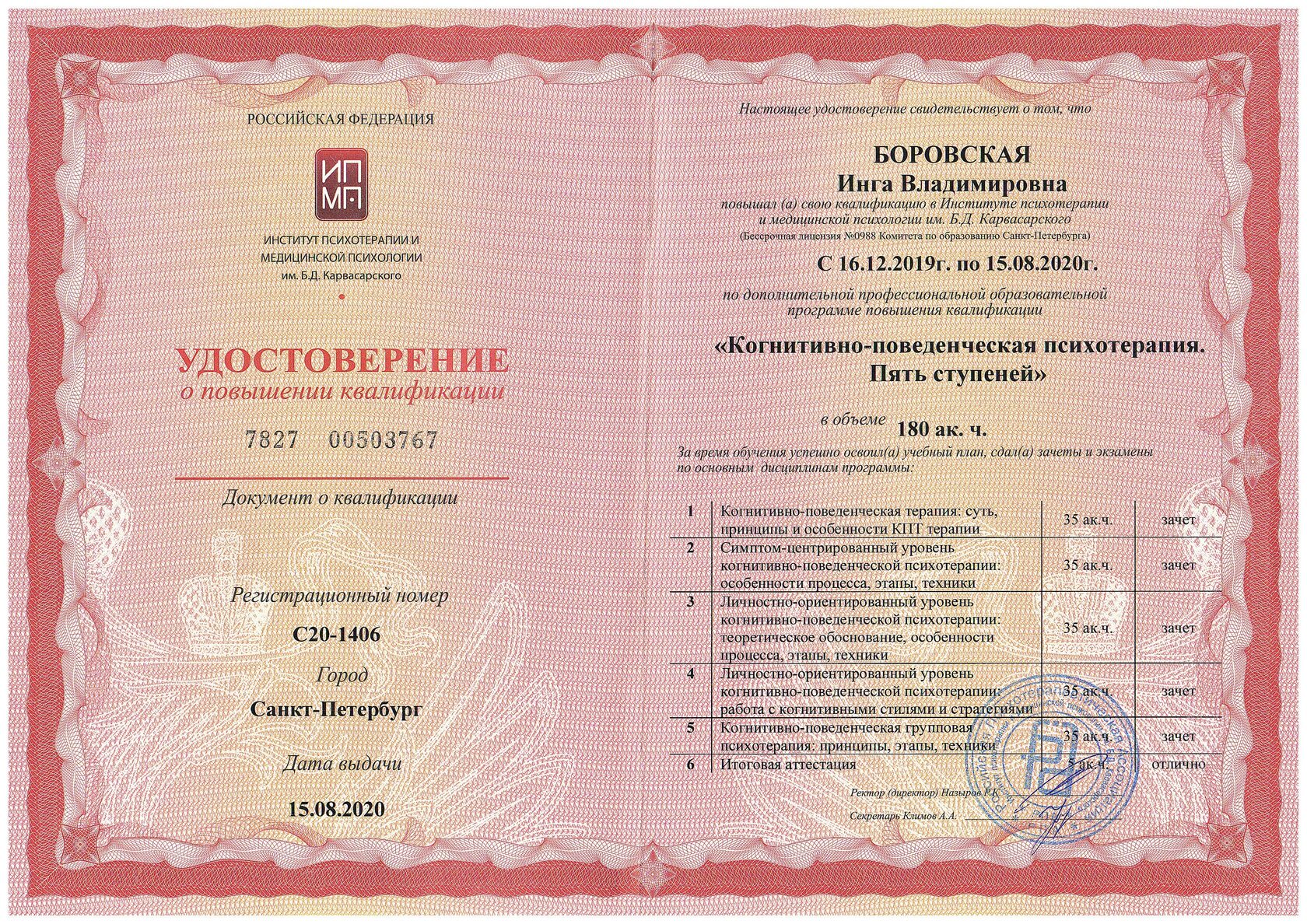 - Когнитивно-поведенческая терапия. Пять ступеней; институт психотерапии и медицинской психологии им. Б.Д. Карвасарского, 180 ак.ч, 2020 г.