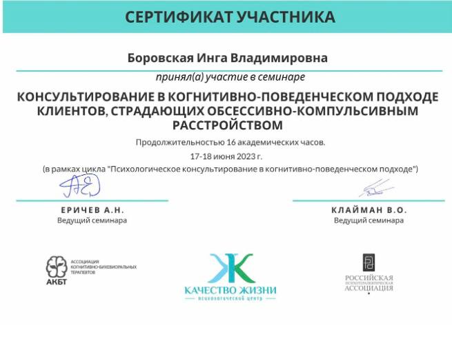 - Консультирование в когнитивно-поведенческом подходе клиентов, страдающих обсессивно-компульсивным расстройством, 16 часов, 2023