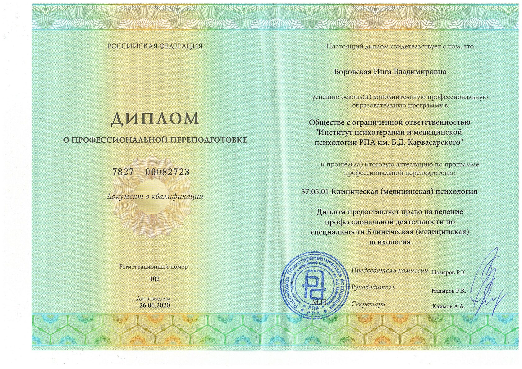 - В 2020 году окончила институт психотерапии и медицинской психологии им. Б.Д. Карвасарского по программе переподготовки «Клиническая психология»