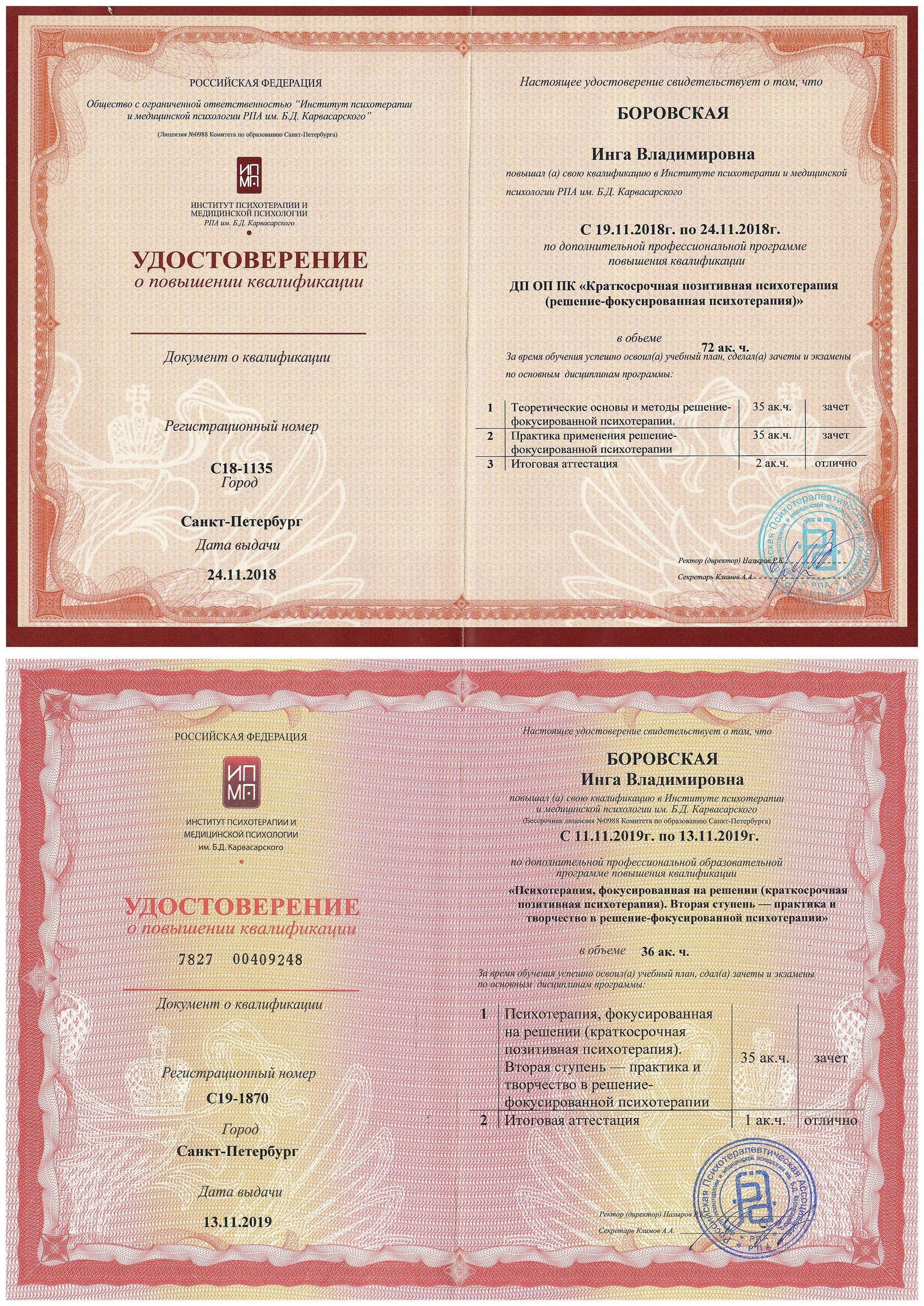 - Психотерапия, фокусированная на решении (краткосрочная позитивная психотерапия); институт психотерапии и медицинской психологии им. Б.Д. Карвасарского, 108 ак.ч, 2018-2019 гг.