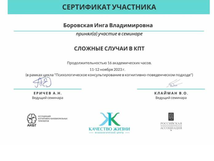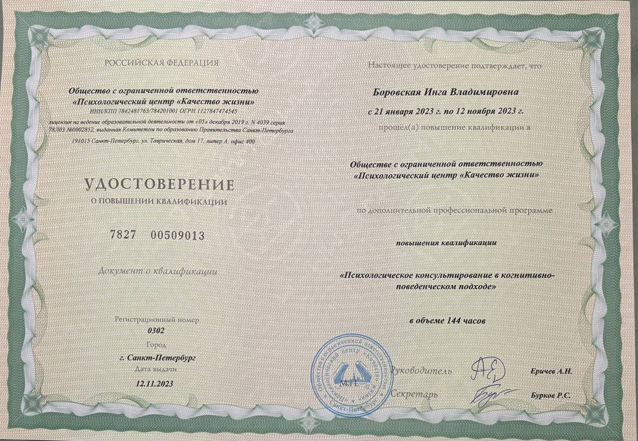 - Повышение квалификации "Психологическое консультирование в когнитивно-поведенческом подходе", 144 часа, 2023