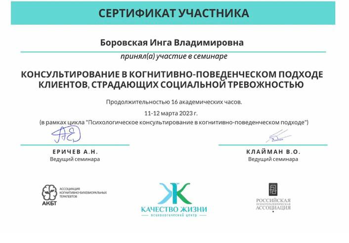 - Консультирование в когнитивно-поведенческом подходе клиентов, страдающих социальной тревожностью, 16 часов, 2023