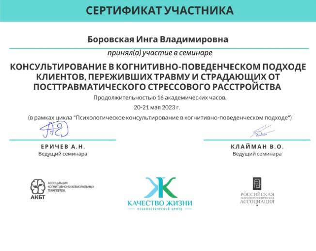 - Консультирование в когнитивно-поведенческом подходе клиентов, переживших травму и страдающих от посттравматического стрессового расстройства, 16 часов, 2023