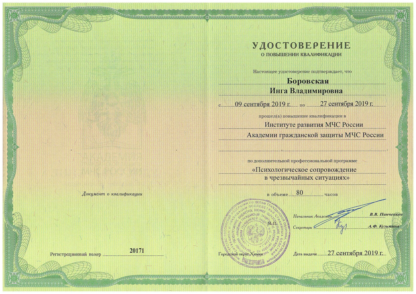 - Психологическое сопровождение в чрезвычайных ситуациях; Академия гражданской защиты Министерства Российской Федерации по делам гражданской обороны, чрезвычайным ситуациям и ликвидации последствий стихийных бедствий, 80 ак.ч, 2019 г.